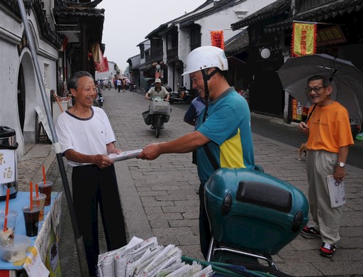 王曉豐在沙溪古鎮(zhèn)投遞報(bào)刊。