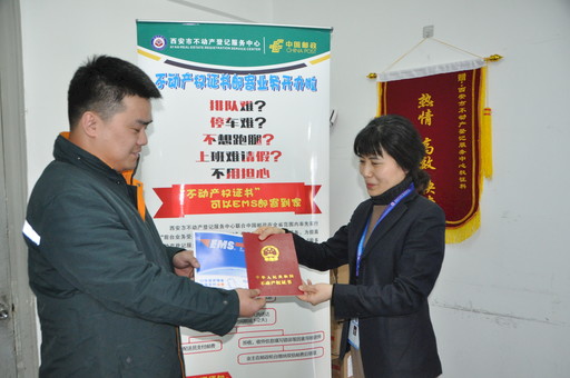 自11月29日起,陜西省西安市不動產(chǎn)登記服務中心正式受理群眾的不動產(chǎn)權(quán)證書郵寄業(yè)務,群眾在辦理二手房交易、房屋抵押注銷、權(quán)屬登記等業(yè)務時可提出郵寄服務申請,證書制作完成后可由EMS送達。這是西安市郵政寄遞事業(yè)部切入政府便民惠民工作、實現(xiàn)郵政便民服務的又一次拓展。圖為西安市不動產(chǎn)登記服務中心的工作人員將第一件要郵寄的證書交到EMS工作人員手中?! 鯊堁╃?nbsp; 攝影報道