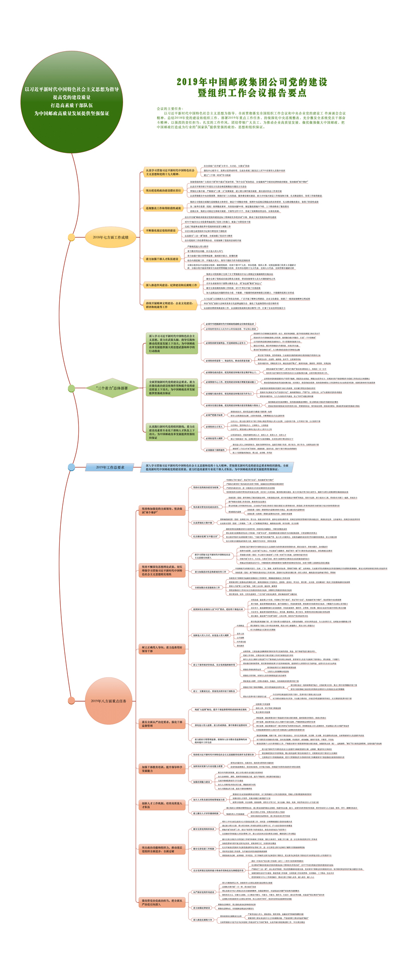 會(huì)議從七個(gè)方面總結(jié)了2018年郵政系統(tǒng)黨的建設(shè)和組織工作所取得的成績(jī):認(rèn)真學(xué)習(xí)貫徹習(xí)近平新時(shí)代中國(guó)特色社會(huì)主義思想和黨的十九大精神;突出把黨的政治建設(shè)擺在首位;巡視整改工作取得階段性成效;不斷強(qiáng)化基層黨組織建設(shè);著力加強(qiáng)干部人才隊(duì)伍建設(shè);深入推進(jìn)作風(fēng)建設(shè)、紀(jì)律建設(shè)和反腐敗工作;持續(xù)開(kāi)展精神文明建設(shè)、企業(yè)文化建設(shè)、群團(tuán)和統(tǒng)戰(zhàn)等工作。