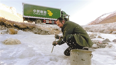 冰雪天氣,其美多吉在雪線(xiàn)郵路鑿冰取水。(四川省委宣傳部供圖)
