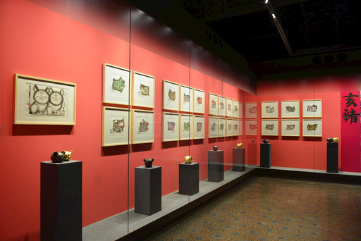 第一部分“生生不息”,意為“生肖輪回,生生不息”,不僅是指人類生命的生長與繁殖,也喻指韓美林藝術(shù)創(chuàng)作的變化與創(chuàng)生。這部分的展品,以韓美林創(chuàng)作的十二生肖動(dòng)物作品為主,依照子、丑、寅、卯等十二生肖的排序,形成既連續(xù)又獨(dú)立的12個(gè)展示板塊。每一個(gè)板塊以一個(gè)生肖為主題,通過將韓美林相關(guān)的平面作品、立體作品以及陶瓷、紫砂、木雕、鐵藝等不同媒介的作品進(jìn)行展陳布置,既多樣豐富又統(tǒng)一整體。