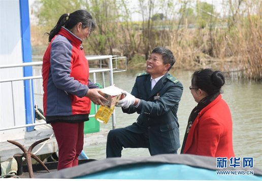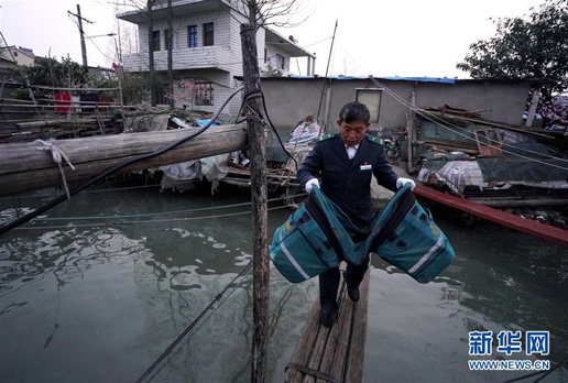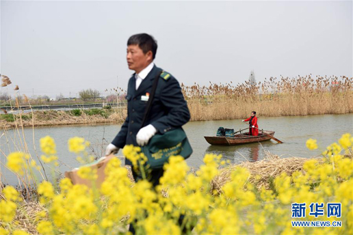3月30日,唐真亞帶著郵包來到碼頭,準備出發(fā)送郵件。 新華社記者 季春鵬 攝