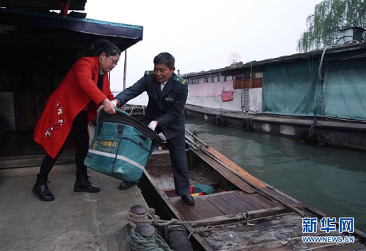 3月30日,唐真亞在新灘村上岸送郵件,妻子閆玲劃船跟隨。新華社記者 黃曉勇 攝