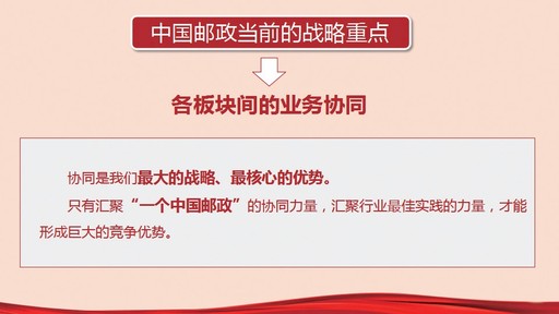 黨課關(guān)于中國(guó)郵政當(dāng)前的戰(zhàn)略重點(diǎn)就是“各板塊間的業(yè)務(wù)協(xié)同”這一論述,讓人印象深刻,既有立足現(xiàn)代中國(guó)郵政發(fā)展的歷史視野、大局格局,又體現(xiàn)了基于新時(shí)代,基于高科技、大數(shù)據(jù)廣泛運(yùn)用所帶來的新的危機(jī)與挑戰(zhàn)下的競(jìng)爭(zhēng)力思考與選擇。黨課強(qiáng)調(diào),協(xié)同是中國(guó)郵政最大的戰(zhàn)略、最核心的優(yōu)勢(shì)。協(xié)同的作用是整體遠(yuǎn)遠(yuǎn)大于部分的簡(jiǎn)單加總,但更多的時(shí)候是n次冪關(guān)系。只有匯聚“一個(gè)中國(guó)郵政”的協(xié)同力量,匯聚行業(yè)最佳實(shí)踐的力量,才能形成巨大的競(jìng)爭(zhēng)優(yōu)勢(shì)。