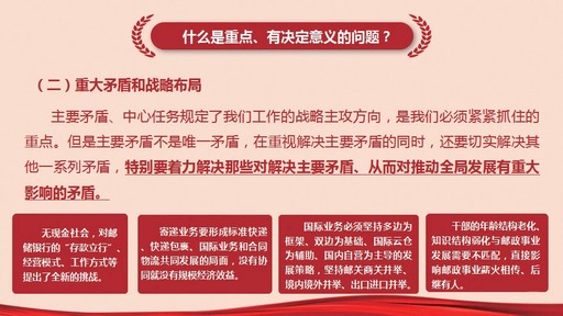 比如,郵儲(chǔ)銀行面臨哪些挑戰(zhàn)?寄遞業(yè)務(wù)面臨哪些挑戰(zhàn)?保險(xiǎn)業(yè)務(wù)面臨哪些挑戰(zhàn)?我們的普遍服務(wù)面臨哪些挑戰(zhàn)?了解了這些主要矛盾,還要明確解決的方案和具體措施,明確我們的中心任務(wù)。比如對(duì)郵儲(chǔ)銀行,我們提出要以實(shí)施“12345”的工作思路作為中心任務(wù),就是要堅(jiān)持轉(zhuǎn)型發(fā)展這條主線,打造城鄉(xiāng)“雙輪驅(qū)動(dòng)”戰(zhàn)略格局,發(fā)揮服務(wù)社區(qū)、服務(wù)中小企業(yè)、服務(wù)“三農(nóng)”的三大優(yōu)勢(shì),強(qiáng)化總部引領(lǐng)、風(fēng)險(xiǎn)管理、信息科技、人才隊(duì)伍四大支撐,推進(jìn)向特色化、綜合化、輕型化、智能化、集約化“五化”轉(zhuǎn)型;對(duì)寄遞業(yè)務(wù),要以“時(shí)限提升、環(huán)節(jié)降本、服務(wù)改善、目標(biāo)市場(chǎng)開發(fā)、IT賦能”的思路,將寄遞業(yè)務(wù)打造成“國(guó)家隊(duì)”作為中心任務(wù);對(duì)中郵保險(xiǎn),要以開放合作、引戰(zhàn)混改、打造成新的增長(zhǎng)極作為中心任務(wù)。還有審計(jì)工作,要以加強(qiáng)以合規(guī)、效能為核心的管理監(jiān)督、效能監(jiān)督、效益監(jiān)督為中心任務(wù)。