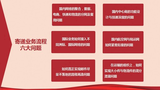 我們現(xiàn)在在流程方面主要有六大問題,大家一定要認(rèn)真研究解決。一是國(guó)內(nèi)網(wǎng)絡(luò)的整合,普服、電商、快遞和物流的分網(wǎng)及復(fù)用問題。哪些地方需要分網(wǎng)?是基于流量還是基于客戶不同的需求?到底怎么辦?德國(guó)郵政DHL有完全獨(dú)立的四大公司,是四個(gè)獨(dú)立的法人,但是DHL在德國(guó)農(nóng)村仍然是一個(gè)網(wǎng)絡(luò)服務(wù),我們?cè)趺崔k?二是國(guó)內(nèi)中心局的功能設(shè)計(jì)與投遞深度的問題。要研究是不是需要一個(gè)個(gè)孤立的分揀中心,然后經(jīng)過三次、四次分揀,不停落地?要不要集包?能不能直接分揀到段道口?三是國(guó)際業(yè)務(wù)如何接入不同洲際、國(guó)際網(wǎng)絡(luò)的問題。四是國(guó)內(nèi)航空網(wǎng)與陸運(yùn)網(wǎng)如何緊密銜接的問題。DHL在萊比錫有一個(gè)分揀中心,他們的航運(yùn)中心一邊坐著陸運(yùn)的人,一邊坐著空運(yùn)的人,中間坐著所謂的管理層,天氣預(yù)報(bào)的大屏幕就在后面,一旦出現(xiàn)問題,比如哪個(gè)國(guó)際方向不能飛了,改陸路怎么改,幾個(gè)部門的人一協(xié)商,馬上進(jìn)行車輛調(diào)度,然后就可以從空運(yùn)轉(zhuǎn)陸運(yùn),同樣可以實(shí)現(xiàn)次日遞或者隔日遞。而我們南京集散中心,有沒有陸運(yùn)的人?空運(yùn)和陸運(yùn)怎么結(jié)合?不能因?yàn)樘焐洗騻€(gè)雷,飛機(jī)不能落地就不運(yùn)了,結(jié)果客戶寄的櫻桃爛了,草莓也爛了。五是如何真正實(shí)現(xiàn)郵件盡量不落地的流程再造問題,我們這里說的11個(gè)環(huán)節(jié)、18個(gè)過程,實(shí)際上還不止這些,中間還有幾次分揀。六是在運(yùn)輸?shù)慕M織上,如何實(shí)現(xiàn)大小件與物流件的混分混裝問題。這些問題都是影響我們生產(chǎn)效率的核心問題,大家一定要認(rèn)真研究解決。所以,我們說首先要解決“有人看、有人干”的問題,就是要讓大家多看報(bào)表、多找問題,然后研究解決改善的辦法。