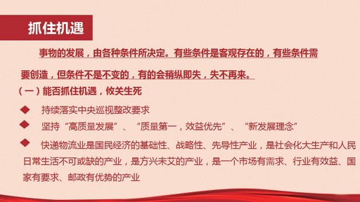 能否抓住機(jī)遇,攸關(guān)生死。當(dāng)前,我們要以持續(xù)落實(shí)中央巡視整改要求為契機(jī),認(rèn)真查找企業(yè)改革發(fā)展中存在的問題,以整改促發(fā)展,堅(jiān)持問題導(dǎo)向,堅(jiān)持高質(zhì)量發(fā)展,堅(jiān)持質(zhì)量第一、效益優(yōu)先,堅(jiān)持新發(fā)展理念,努力打造行業(yè)的“國(guó)家隊(duì)”。比如,快遞物流業(yè)是支撐國(guó)民經(jīng)濟(jì)發(fā)展的基礎(chǔ)性、戰(zhàn)略性、先導(dǎo)性產(chǎn)業(yè),是社會(huì)化大生產(chǎn)和人民日常生活不可或缺的產(chǎn)業(yè),是方興未艾的產(chǎn)業(yè),是一個(gè)市場(chǎng)有需求、行業(yè)有效益、國(guó)家有要求、郵政有優(yōu)勢(shì)的產(chǎn)業(yè),我們必須搶抓機(jī)遇、加快發(fā)展,否則,我們就會(huì)徹底丟掉這個(gè)市場(chǎng),丟掉核心業(yè)務(wù),郵政何以立足。