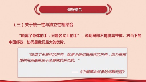 三要做到統(tǒng)一性與獨(dú)立性相結(jié)合。哲學(xué)里說,“脫離了身體的手,只是名義上的手”。手是干什么用的?要抓東西,要吃飯,要?jiǎng)谧?,但脫離了身體的時(shí)候,這些功能都沒有了,只是名義上的一個(gè)手。所以,局部不能脫離整體,獨(dú)立性與統(tǒng)一性要相結(jié)合。同樣道理,對(duì)當(dāng)前的中國(guó)郵政來說,協(xié)同是我們最大的優(yōu)勢(shì),郵儲(chǔ)銀行和中郵保險(xiǎn)一旦脫離了中國(guó)郵政,就失去了中國(guó)郵政的網(wǎng)絡(luò)優(yōu)勢(shì)、協(xié)同優(yōu)勢(shì)和品牌優(yōu)勢(shì),難以很好地生存。因此,看待問題、分析問題、解決問題都要做到統(tǒng)一性與獨(dú)立性相結(jié)合,通過不同的視野、站在不同的角度看待問題,得出來的結(jié)論是完全不一樣的。