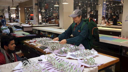 在中國重要的玉石集散中心——云南省德宏傣族景頗族自治州瑞麗市,來自四面八方的人們在各大玉石交易市場淘寶。市場里,有一抹流動的“郵政綠”,始終如一地為玉石珠寶寄遞保駕護(hù)航。