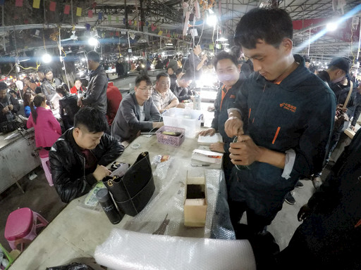晚上10點,記者走進(jìn)瑞麗市的姐告玉城夜市,這里燈火通明、人聲鼎沸,2500多個攤位前擠滿了全國各地慕名而來的玉石交易商、文玩收藏家及游客。不同店鋪、攤位前,主播們對著手機、打著手電,正忙碌地展示貨品,旁邊簇?fù)碇却鲐浀纳碳遥芏喽际蔷挼榧倘?。直播中如有客戶線上下單,主播便快速將手中展示的貨品裝袋,用記號筆標(biāo)注,再進(jìn)行下一件貨品展示,最后,通過快遞將銷售的貨品寄出。