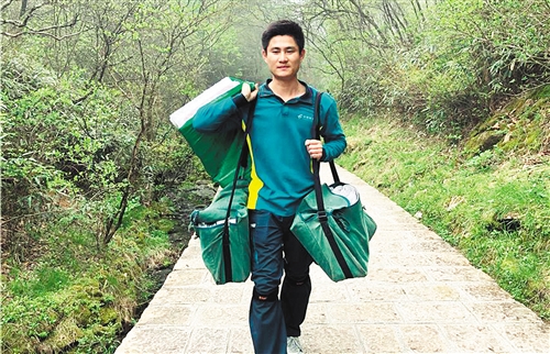 謝菲俊所在投遞班的班長林鵬舉告訴記者,黃山風(fēng)景區(qū)內(nèi)山路崎嶇,無法行車,每天都要人力背負(fù)重物翻山越嶺。謝菲俊一干就是3年多。