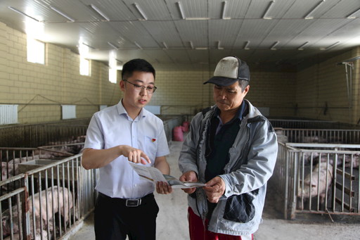 秦闖(左)進(jìn)豬舍為農(nóng)戶宣傳小額貸款。