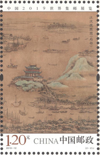 《江漢攬勝圖》是明代絹本國畫,國家一級(jí)文物,現(xiàn)藏于武漢博物館。畫面中心內(nèi)容為長江、漢水交匯及水上船只通行景象,漢陽晴川閣與武昌黃鶴樓隔江相望。這幅畫集中表現(xiàn)了武漢最為重要的地理、人文風(fēng)貌,體現(xiàn)武漢悠久歷史文化的同時(shí),也飽含了世界郵展匯聚八方來客的喻義。