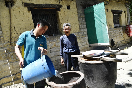 在董如德老人家里,孫吉剛掀起身旁的水缸蓋子看了看,發(fā)現(xiàn)缸里的水已經(jīng)不多,自然地提起一旁的水桶,到附近水井里提了兩桶水上來。