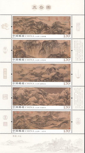 最終,這幅“不求形似,唯求達(dá)意”的名畫被定格于一套5枚郵票之上,完整地展示了原畫獨(dú)特的風(fēng)貌。第一圖為“日觀晴曦”,表現(xiàn)泰山旭日東升的壯觀景致。第二圖“太華清秋”描繪的是華山懸崖峭壁的險峻山勢,蒼松小橋,瀑樹相映。第三圖“融峰雨色”刻畫的是衡山祝融峰煙雨縹緲的夏日景致。第四圖“恒塞積雪”展現(xiàn)的是恒山白雪皚皚的冬季景觀。第五圖“二室爭奇”表現(xiàn)的是嵩山叢山峻嶺的中原山脈及點(diǎn)綴其間的清幽古寺。