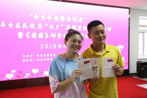 當天,豐臺區(qū)民政局與豐臺區(qū)郵政分公司聯(lián)合制作、特別推出了“今生今世陪你到老”紀念郵折,并首發(fā)一套主題為“十全十美”寓意的紀念郵戳,涵蓋“陪你到老”“愛由心生”“天作之合”“天長地久”“今生今世”“永結(jié)同心”“愛你一生”“情投意合”“相親相愛”“長相廝守”10個美好祝福詞。凡是當日到豐臺區(qū)民政局婚姻登記處領(lǐng)取結(jié)婚證的新人,都可以免費獲贈紀念郵折一套,并加蓋任意紀念郵戳。“七夕是我國紀念愛情的傳統(tǒng)節(jié)日,選擇這一天領(lǐng)證對我們來說有著特殊的含義。我一直很羨慕父母輩的愛情,選一人伴一生,所以,這次我和他選擇了‘陪你到老’這枚郵戳,希望我們能白頭偕老?!碧锱空f。