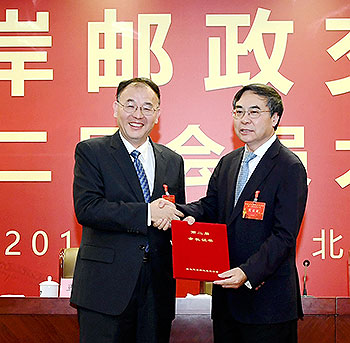 國家郵政局局長馬軍勝向集團(tuán)公司董事長劉愛力頒發(fā)海峽兩岸郵政交流協(xié)會第二屆會長證書