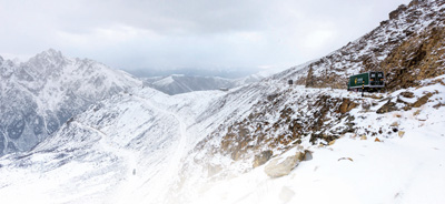 十來分鐘后,風(fēng)小了。視線重新打開,公路不見了,一座雪山平地而起,不知從何處移來。世界白茫茫一片。