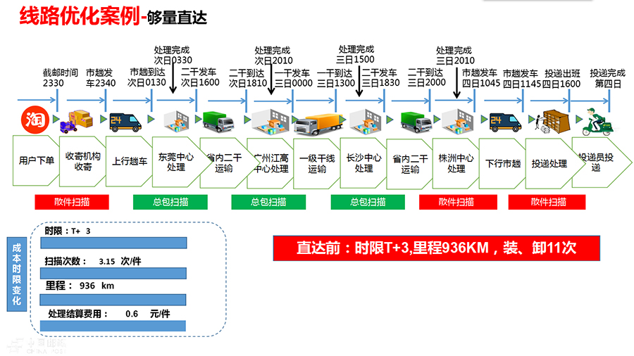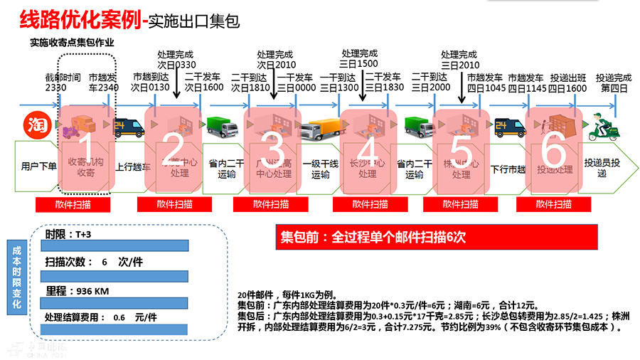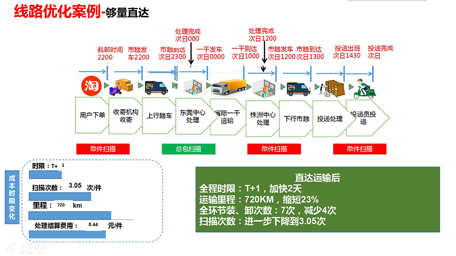 郵路要怎么捋?就是要以和競(jìng)爭(zhēng)對(duì)手對(duì)標(biāo)為任務(wù),對(duì)每條線路從收寄到投遞進(jìn)行全環(huán)節(jié)梳理、全鏈路優(yōu)化。以廣東東莞—湖南株洲線路為例:這條線路目前日均包件量1000件,在全散件模式下,由于沒有直達(dá)郵路,郵件從收寄到投遞,每個(gè)郵件全程需經(jīng)過6次散件分揀,11次散件裝卸搬運(yùn),時(shí)限T+3。通過全環(huán)節(jié)捋、全流程捋、各環(huán)節(jié)優(yōu)化,改為在東莞實(shí)施前置集包,散件在收寄網(wǎng)點(diǎn)直接分揀封入株洲總包,同時(shí)開通東莞—株洲直達(dá)郵路,郵件由原來在東莞—廣州—長沙—株洲間散件裝卸,優(yōu)化為東莞—株洲總包裝卸。通過這兩種優(yōu)化措施的結(jié)合,郵件由散件分揀6次、裝卸搬運(yùn)11次,將變?yōu)樯⒓謷?次、總包分撥3次、裝卸搬運(yùn)7次,減少了廣州和長沙的4次總包裝卸作業(yè),處理結(jié)算費(fèi)用降低39%,裝卸效率大幅提升;時(shí)限水平由T+3將減少為T+1,達(dá)到次日遞,超過主要競(jìng)爭(zhēng)對(duì)手;全程運(yùn)輸里程從936公里將縮短為720公里,減少了23%,節(jié)約了運(yùn)輸成本。此外,在該線路日均郵件量較少的情況下,可以采取組開深圳—東莞—株洲串行直達(dá)的運(yùn)輸方式,在提高車輛裝載率的同時(shí),實(shí)現(xiàn)當(dāng)天收寄的東莞—株洲郵件和18點(diǎn)前收寄的深圳—株洲郵件全程時(shí)限T+1。