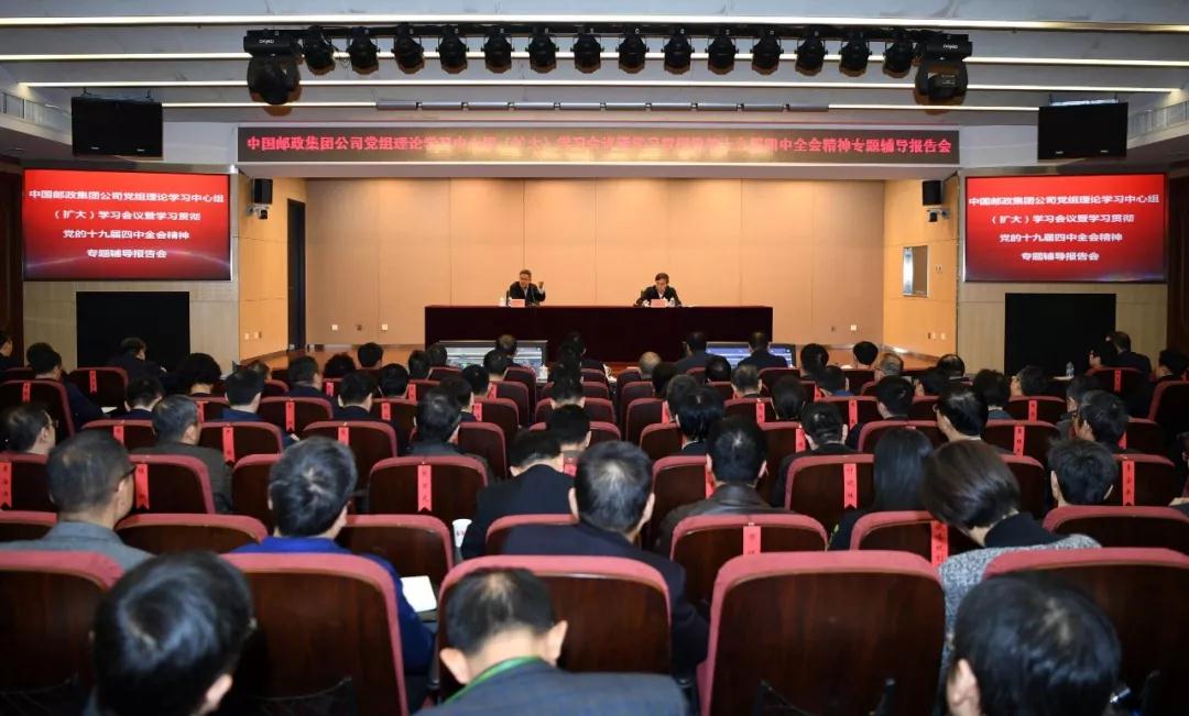 11月21日,中國郵政集團(tuán)公司舉辦黨組理論學(xué)習(xí)中心組(擴(kuò)大)學(xué)習(xí)會(huì)議暨學(xué)習(xí)貫徹黨的十九屆四中全會(huì)精神專題輔導(dǎo)報(bào)告會(huì),邀請(qǐng)中共中央黨校教授、中央電視臺(tái)特約時(shí)政評(píng)論員辛鳴解讀黨的十九屆四中全會(huì)精神。中國郵政集團(tuán)公司黨組書記劉愛力主持會(huì)議。集團(tuán)公司黨組成員、總部機(jī)關(guān)三級(jí)副及以上人員和控股子公司、寄遞事業(yè)部、在京直屬各單位領(lǐng)導(dǎo)班子成員在主會(huì)場(chǎng)參加會(huì)議;集團(tuán)公司各控股子公司、直屬各單位和各?。▍^(qū)、市)、地市、縣郵政三大板塊四級(jí)副及以上黨員干部在各分會(huì)場(chǎng)參加會(huì)議。