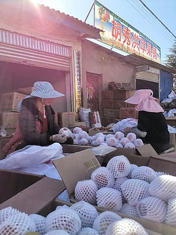 2015年,經(jīng)過培訓(xùn)后,老胡硬著頭皮開起了淘寶網(wǎng)店、郵樂網(wǎng)店?!班]政公司的人手把手教我。剛開始不懂營銷,我只能用傻辦法,見人就添加QQ好友、加微信,發(fā)網(wǎng)店地址,有時(shí)還免費(fèi)寄給他們品嘗。”老胡說,剛開始微信好友加了80多人,一年賣出兩萬多斤蘋果。