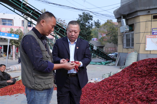 牛志勇(右)在農(nóng)村走訪調(diào)研,與辣椒收購大戶交流,了解客戶金融需求。