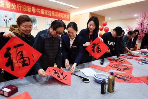 1月9日,郵儲銀行湖南省分行直屬支行內(nèi),書畫家們正為客戶書寫“?!弊趾痛郝?lián)。當(dāng)天,湖南省分行舉辦了迎新春書畫家送福寫春聯(lián)活動。書畫家張青渠、袁紹明、俞成林、張楚務(wù)、胡偉一行來到網(wǎng)點,現(xiàn)場潑墨揮毫,通過寫春聯(lián)、寫“?!弊值姆绞剑统?020年的新春祝福,共同迎接新春的到來?! 鯒钜伶?nbsp; 攝影報道