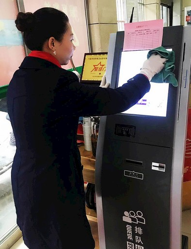 湖南省長沙市岳麓區(qū)郵政分公司日前組織員工對網(wǎng)點(diǎn)進(jìn)行全面消毒,并在機(jī)具上粘貼“本日已消毒”告示。要求網(wǎng)點(diǎn)每日安排專人負(fù)責(zé)消毒工作,讓郵政客戶放心進(jìn)入網(wǎng)點(diǎn)辦理郵政業(yè)務(wù)。圖為銀盆嶺郵政網(wǎng)點(diǎn)員工對叫號機(jī)進(jìn)行消毒?!豕鹚?nbsp; 攝影報(bào)道