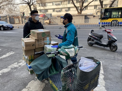 記者呂磊(左)跟班采訪北新橋投遞部投遞員張志福。 周勇 攝