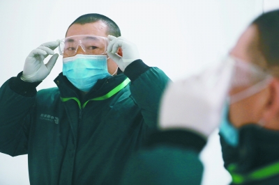 出發(fā)前,侯毅在衣冠鏡前整理著裝并檢查自己的個人防護(hù)裝備是否佩戴到位。