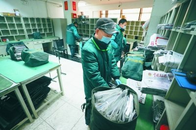 早上7點,侯毅已到崗,按順序整理好要送的報紙、信件,一個大郵包被塞得滿滿的。出發(fā)前,他先給訂戶打電話,有人會到門口來取,有人會讓他放到門衛(wèi)處,還有人會讓他放到小區(qū)統(tǒng)一的暫存點。哪個用戶是什么習(xí)慣,他都熟稔于心。臨走,侯毅戴上塑膠手套、護(hù)目鏡,全身消毒,兜里隨時揣著一瓶消毒凝膠。