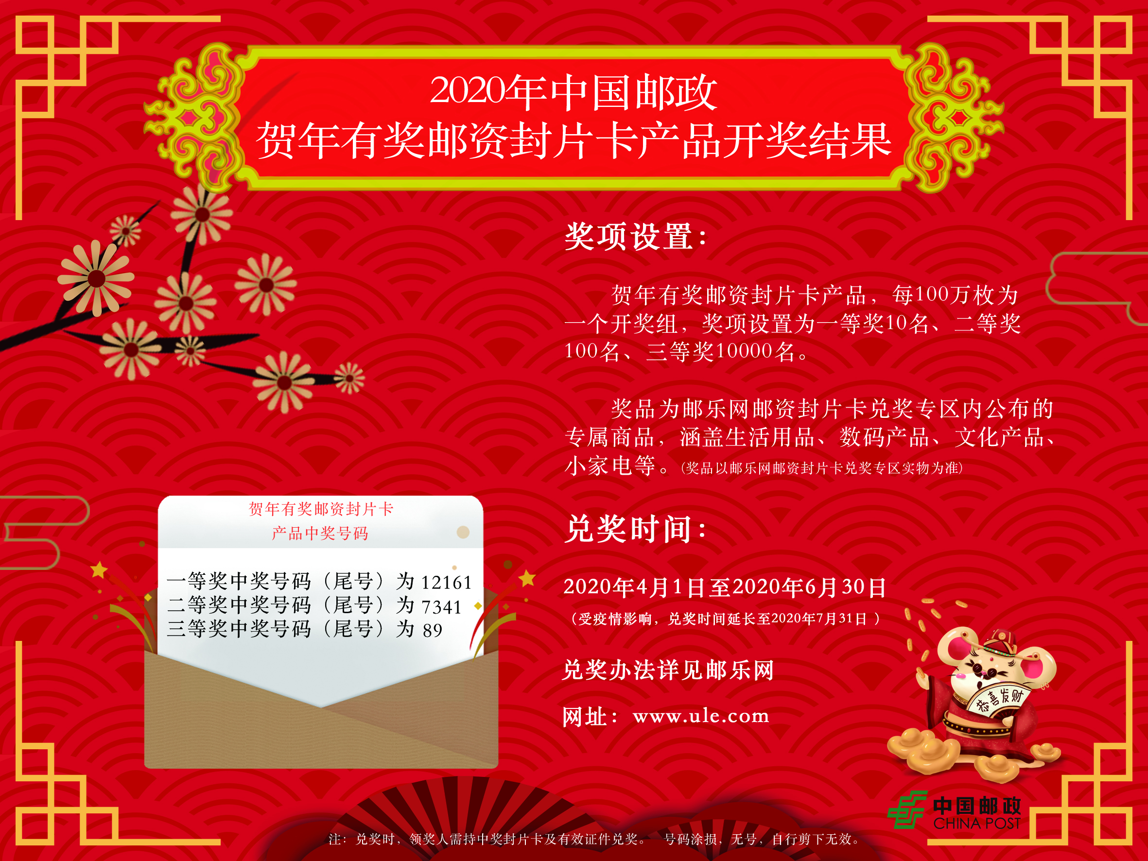 2020年賀年有獎(jiǎng)郵資封片卡中獎(jiǎng)號(hào)碼于3月18日產(chǎn)生。現(xiàn)將具體中獎(jiǎng)信息通知如下: