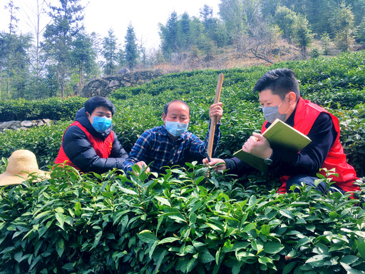 圖為“金融春風(fēng)服務(wù)隊(duì)”在茶園了解春茶追肥與生長情況,宣傳郵儲(chǔ)貸款產(chǎn)品?! 趵蠲?nbsp; 攝影報(bào)道