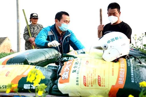 江蘇省射陽縣郵政分公司開展“戰(zhàn)疫情、搶農(nóng)時、郵我助,郵農(nóng)一心保春耕“活動,基層員工利用班前班后時間將農(nóng)民需要的復(fù)合肥配送到農(nóng)民家門口、田間地頭,并組織志愿者協(xié)助缺勞力戶為莊稼施肥鋤草。截至3月17日,該分公司已向全縣農(nóng)民配送復(fù)合肥546噸,幫助17戶缺勞力戶解除農(nóng)活上的后顧之憂。圖為通洋支局投遞員將肥料送到農(nóng)戶地頭?!鮿⒌铝?nbsp; 攝影報道