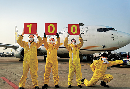 3月21日,郵航CF9016航班于7點(diǎn)19分飛抵武漢天河機(jī)場,飛行員在機(jī)場擺起pose,慶祝中國郵政航空執(zhí)飛疫區(qū)航班100架次這一榮耀時(shí)刻。