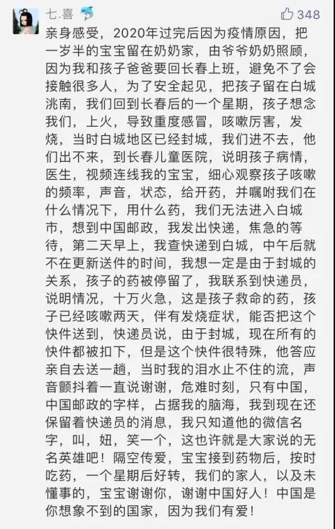 “感謝郵政,讓我被困在湖北那段日子里,還能收到來自外地小伙伴的防疫用品援助,余后很多年都會記得,在2020年初那個(gè)困難的日子里,祖國需要,郵政在!”
