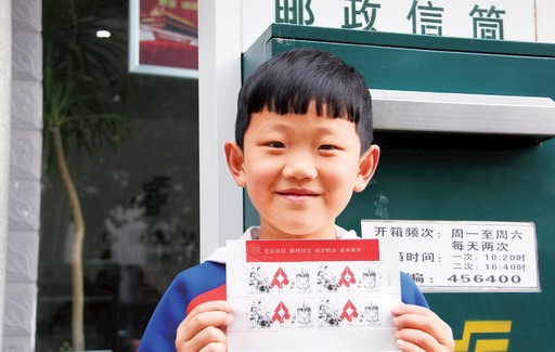 5月11日,河南省安陽市滑縣紅旗路郵政營業(yè)廳外,一位小郵迷成功購得心儀的《眾志成城 抗擊疫情》郵票,興奮地展示起來。牟會鋒 攝