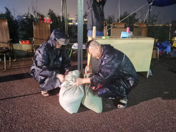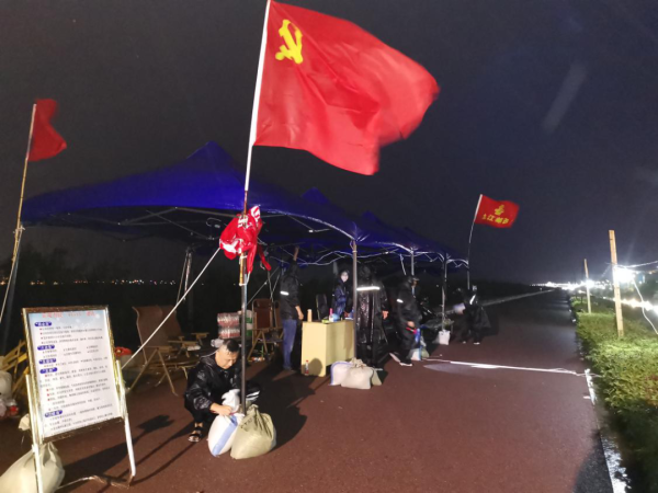 20:30,天還下著小雨,九江市分公司防汛應(yīng)急小分隊(duì)匆忙趕來增援,帶來了我們急需的繩子和照明設(shè)備。他們和留守人員一起清點(diǎn)物資,運(yùn)沙袋,對值班棚進(jìn)行全方面的加固,以確保下一個(gè)班次輪值人員安全。