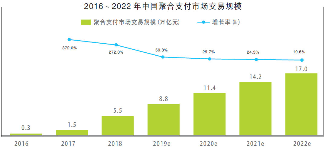 根據(jù)艾瑞咨詢統(tǒng)計,2019年聚合支付市場交易規(guī)模約為8.8萬億元,同比增長59.8%,預計未來該市場的增速將有所回落,但仍能保持較穩(wěn)定的增長。