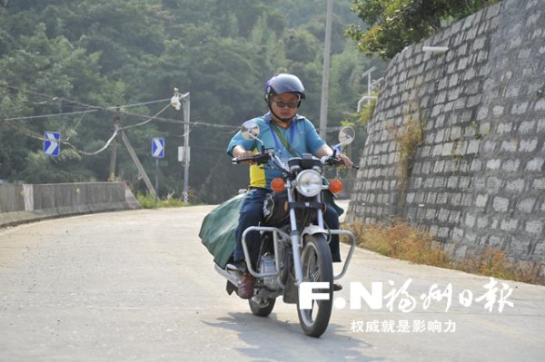 藍(lán)盛金騎行在送錄取通知書的山路上。福州日報記者 鄭帥攝