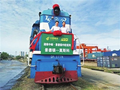 2018年9月28日,首趟“景德鎮(zhèn)—莫斯科”郵政中歐班列從江西景德鎮(zhèn)車站駛出,作為本趟班列的運(yùn)營平臺公司員工,侯磊(右)參加了班列首發(fā)儀式?!跗ゃ彖?攝