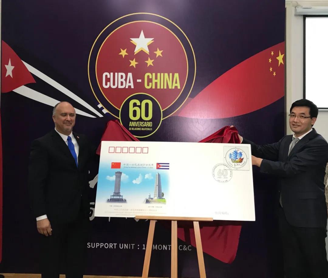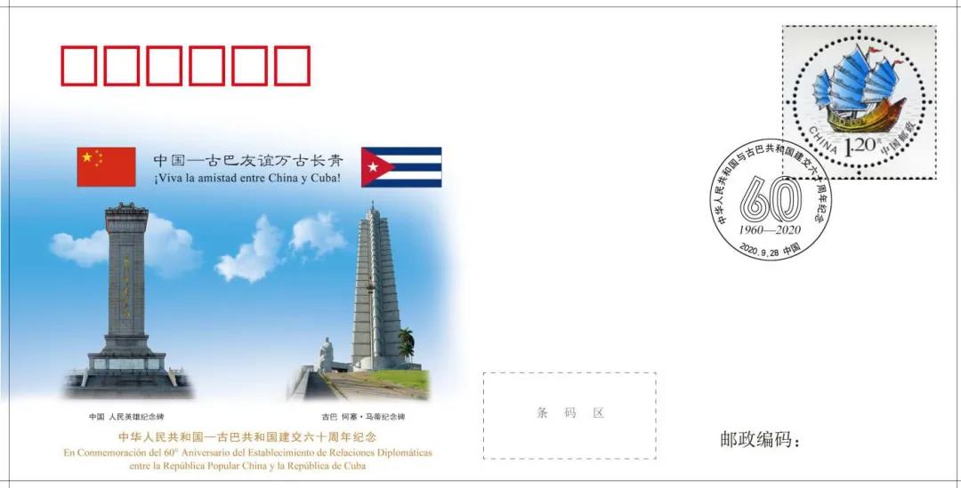 9月28日是中國(guó)古巴建交60周年紀(jì)念日。古巴駐華大使館舉行慶祝招待會(huì),國(guó)務(wù)委員兼外長(zhǎng)王毅出席。為了紀(jì)念這個(gè)特殊的日子,中國(guó)集郵總公司特發(fā)行外交紀(jì)念封一枚。招待會(huì)上,中國(guó)郵政集團(tuán)有限公司總經(jīng)理張金良與古巴駐華大使佩雷拉共同為紀(jì)念封揭幕,張金良代表中國(guó)郵政集團(tuán)有限公司向古巴大使館贈(zèng)送紀(jì)念封。