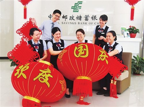 為慶祝新中國成立71周年、歡度中秋佳節(jié),郵儲銀行海南省分行直屬支行員工利用工作之余,買來燈籠、編制中國結,積極營造節(jié)日氛圍,為爭創(chuàng)中國銀行業(yè)“千家示范網點”再添一把火。
