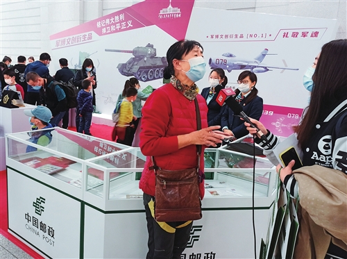 圖為北京郵政在中國(guó)人民革命軍事博物館設(shè)立的臨時(shí)郵局內(nèi),郵迷們積極選購(gòu)郵品并接受媒體采訪。
