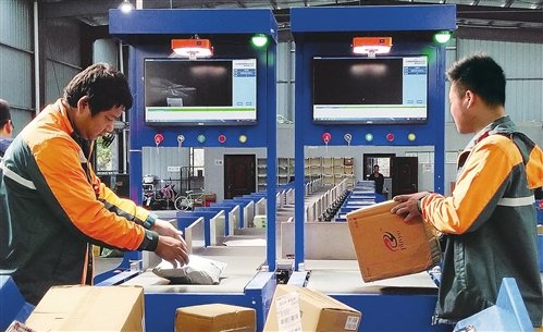 在“雙11”前,浙江省杭州市郵政分公司在4個(gè)經(jīng)營部安裝了自動(dòng)分揀機(jī)。當(dāng)郵件到來后,員工在車廂尾部卸包裹,直接把包裹放在供包機(jī)上。包裹隨著皮帶機(jī)爬上分揀臺,負(fù)責(zé)分揀的員工將包裹面單朝上,分揀臺上的攝像頭一掃,包裹便根據(jù)掃描的信息落入相應(yīng)的段道格口。經(jīng)營部安裝了自動(dòng)分揀機(jī)后,以前是25名員工1個(gè)小時(shí)分揀3000件郵件,現(xiàn)在6個(gè)人就能用1個(gè)小時(shí)分揀完3000件郵件,同時(shí),作業(yè)現(xiàn)場一改往年包裹擺攤、員工無地下腳的場景。目前,有的經(jīng)營部每日進(jìn)口郵件量較平時(shí)增長75%,但有了自動(dòng)分揀機(jī),攬投員早晨出班時(shí)間可提前40分鐘。