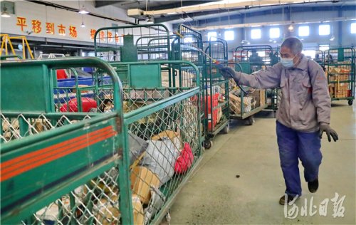 2021年1月7日,位于河北省秦皇島市海港區(qū)臨港物流園區(qū)的中國(guó)郵政集團(tuán)有限公司秦皇島市分公司網(wǎng)路運(yùn)營(yíng)中心內(nèi),工作人員在對(duì)快遞包裹進(jìn)行消殺。