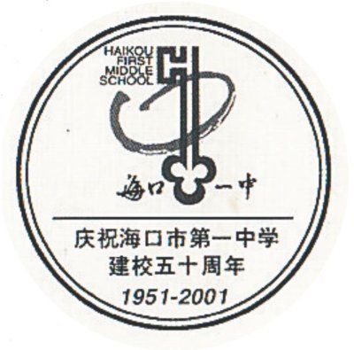 2001年4月10日,??谑屑]公司特發(fā)行了紀(jì)念封一枚。紀(jì)念封貼用“邁入新世紀(jì)”郵票,封圖印有校慶主題、時(shí)任校長(zhǎng)題詞,貼票的下方還以素色印制了校慶紀(jì)念主圖,構(gòu)圖為該校的“金鑰匙”校徽,金鑰匙下方簡(jiǎn)寫校名“??谝恢小钡淖謽?,取自郭沫若先生為該校題寫的校名。