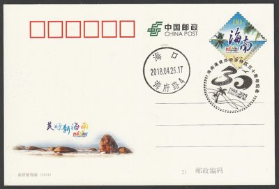 為慶祝海南建省辦經(jīng)濟(jì)特區(qū)30周年,2018年中國(guó)郵政發(fā)行了《美好新海南》普通郵資信封、普通郵資明信片,郵資圖都印有海南旅游徽志。