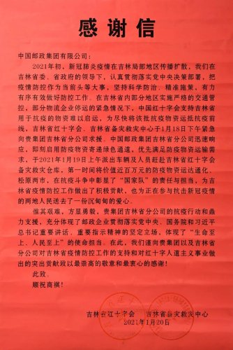 日前,吉林省紅十字會(huì)致信中國郵政集團(tuán)有限公司,感謝吉林郵政迅速啟用抗疫物資運(yùn)輸綠色通道,第一時(shí)間將吉林省紅十字會(huì)價(jià)值近百萬元的抗疫物資運(yùn)達(dá)通化、松原兩市,對中國郵政集團(tuán)有限公司和吉林省分公司在吉林省疫情防控工作中給予的支持和為紅十字人道主義事業(yè)作出的突出貢獻(xiàn)致以崇高的敬意和衷心的感謝。