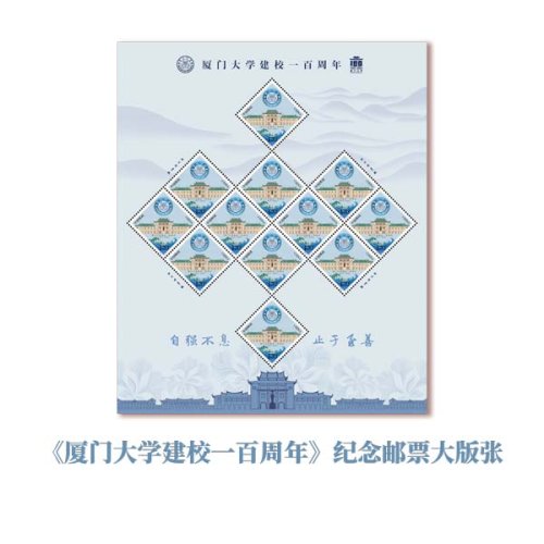 該套郵票采用電腦手繪表現(xiàn)方式,以廈門大學(xué)的標(biāo)志性建筑之一——群賢樓群為主體,同時(shí)表現(xiàn)了?;铡⒔洗髸?huì)堂及海浪等元素,采用菱形設(shè)計(jì),畫面構(gòu)圖嚴(yán)謹(jǐn)、層次分明,色調(diào)清新淡雅,充分彰顯出廈門大學(xué)深厚的歷史底蘊(yùn)、蓬勃的時(shí)代氣息和濃郁的地域特色。郵票版式一借鑒傳統(tǒng)中國(guó)結(jié)的造型符號(hào),采用中軸對(duì)稱的形式進(jìn)行設(shè)計(jì),同時(shí)以剪影方式表現(xiàn)了群賢樓群、校訓(xùn)及百年校慶標(biāo)志,整體畫面富有秩序感和節(jié)奏感。